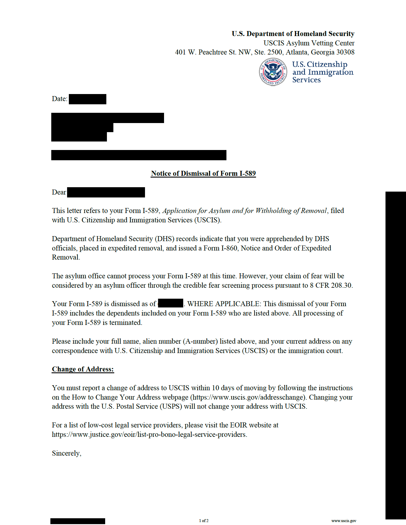 USCIS has started to dismiss some asylum cases by sending a letter. Here is one example, and another example, but there are also other versions of the letter. In these letters, USCIS says that your asylum case has been dismissed, that USCIS will not make a decision on your asylum case, and that you are in a different process called “expedited removal.” ASAP is still trying to learn more about these letters, and we will keep this page updated.