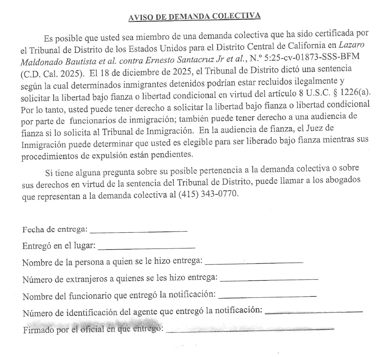 En algunos centros de detención de inmigración, el gobierno está dando este aviso a todos los inmigrantes, sin importar si la demanda Maldonado Bautista se aplica a ellos.