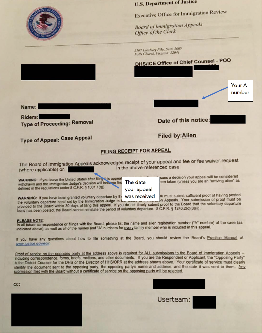 此文件是来自移民上诉委员会 (BIA) 的通知,确认 BIA 已在所示日期收到您的上诉通知。如果您在移民法庭的庇护案件败诉并向 BIA 提出上诉,您应该会收到此通知。当您的案件在 BIA 审理期间,您不应被遣返,但在此过程中您可能会被拘留。您也可以在此处阅读更多关于上诉的信息。