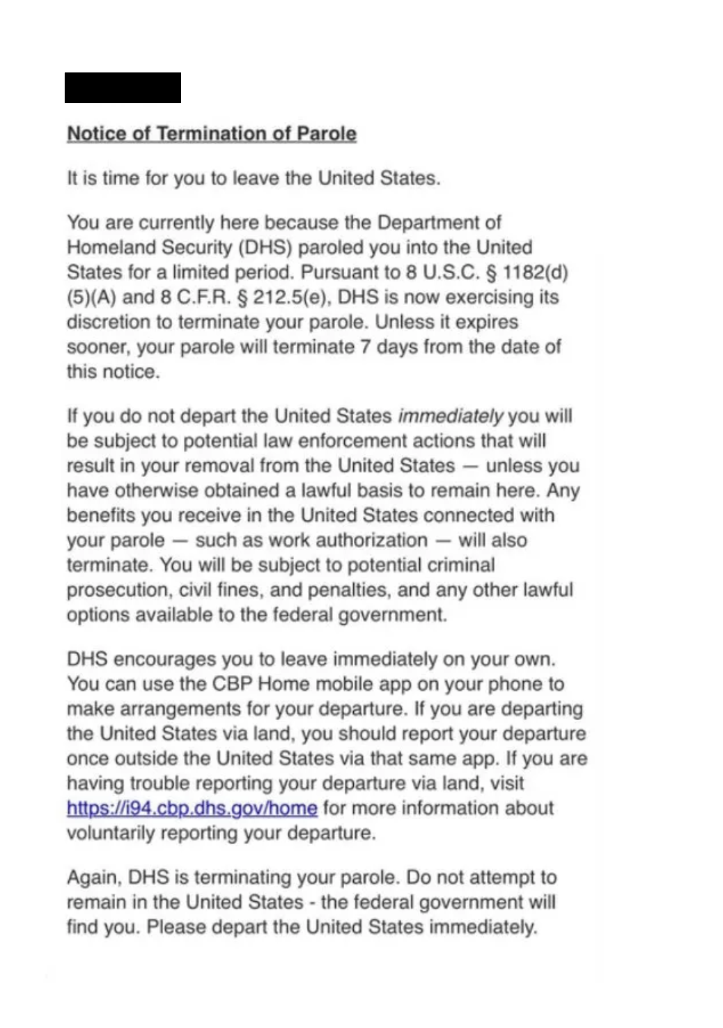 此前,美国政府向通过 CBP One 获得移民假释(parole)的人员发送了此通知,以提前终止其假释。然而,移民们进行了反击,2026 年 3 月,一家法院裁定,通过该通知提前终止 CBP One 假释是非法的。如果您在 2025 年 4 月收到了此通知且当时拥有假释,那么您目前再次拥有假释身份。
