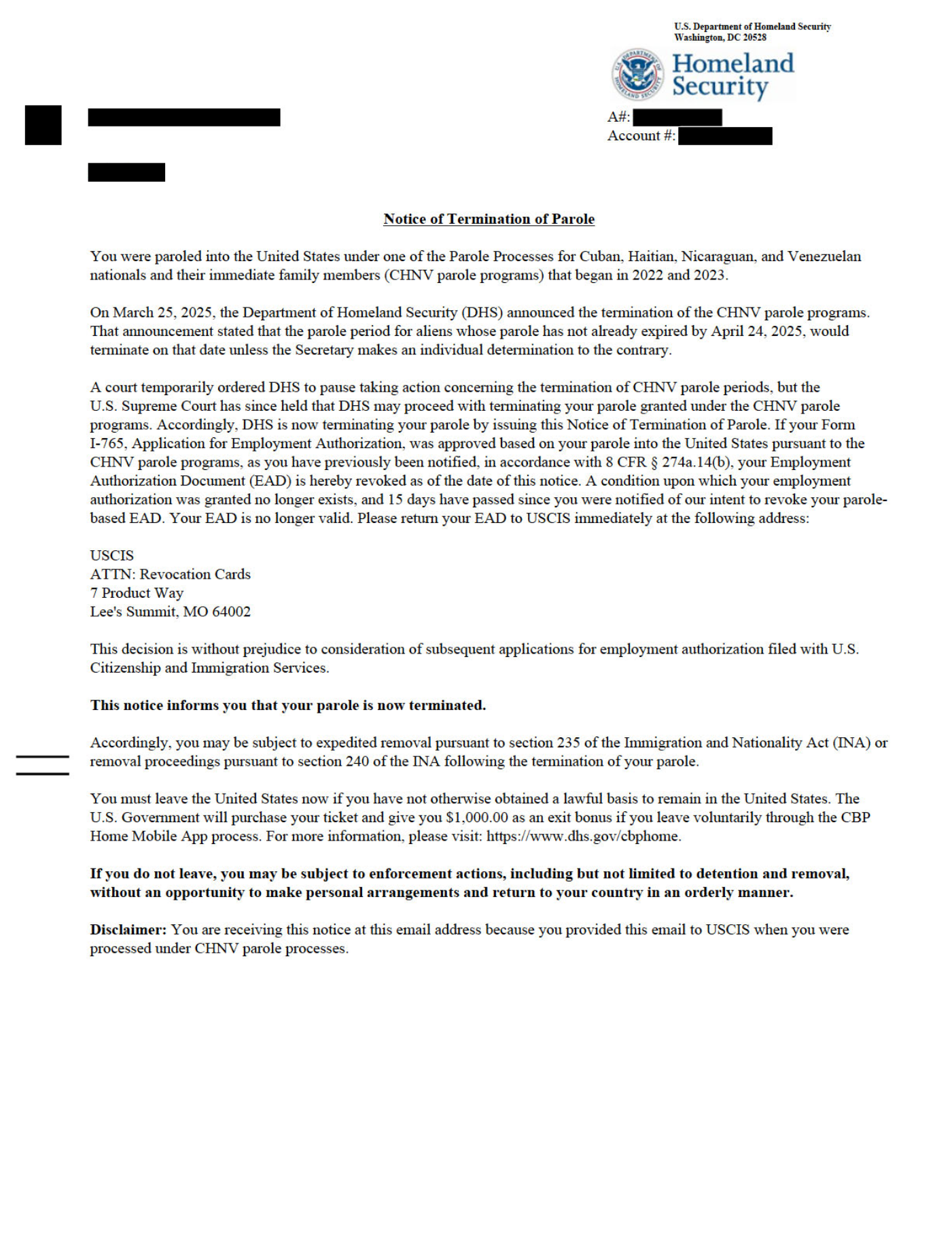 移民曾提起诉讼以暂时阻止这一变化,但在 2025 年 5 月 30 日,最高法院表示政府可以终止 CHNV 假释。移民们正在继续进行诉讼。请在此处了解更多信息。
