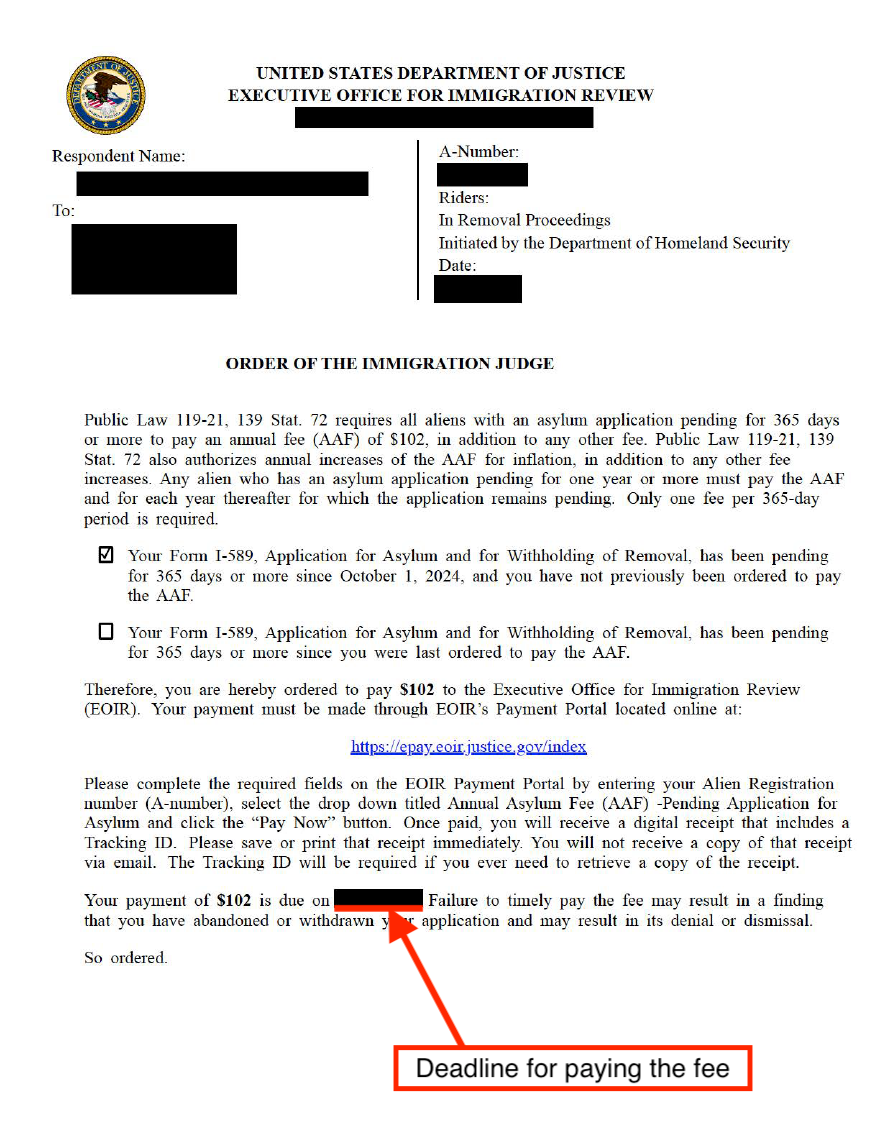 这份来自移民法庭的命令表示您需要缴纳年度庇护费,并包含了缴费截止日期。截至 2026 年 2 月 1 日,年度庇护费为 102 美元。您可以在此移民法庭网站在线缴费。请务必记下您的付款查询 ID,并保存一份收件通知(receipt notice)副本,以便带去参加下一次听证会。