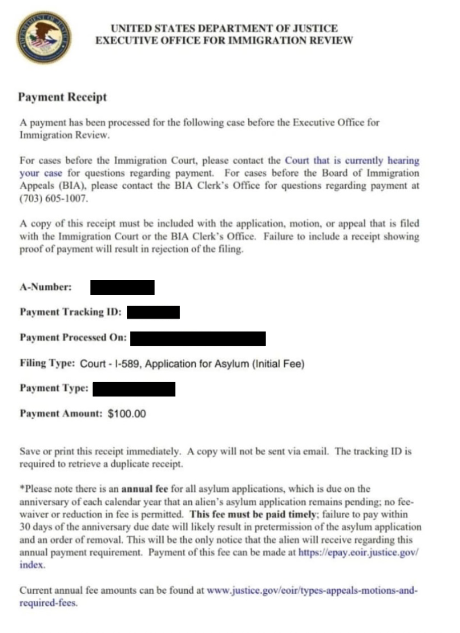 这份来自移民法庭的通知说明您已在此网站缴纳了庇护申请费。当您向移民法庭提交庇护申请(I-589 表格)时,应随附此收件通知(receipt notice)的副本。如果您未附上收据,移民法庭可能会拒绝您的庇护申请。在此查看更多说明。