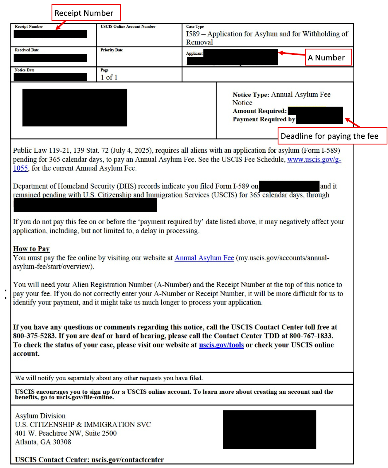 这份来自 USCIS 的通知称,您必须缴纳年度庇护费。您可以在通知中显示“Payment Required by”(缴费截止日期)的地方查看缴纳此费用的截止日期。目前,该费用为 102 美元。